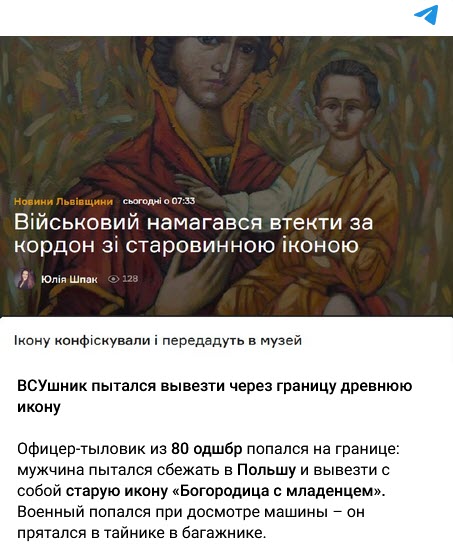 В социальных сетях и на российских пабликах распространяют информацию о том, что военный ВСУ якобы пытался вывезти через границу древнюю икону. «Офицер-тыловик из 80 одшбр попался на границе: мужчина пытался сбежать в Польшу и вывезти с собой старую икону «Богородица с младенцем». Военный попался при досмотре машины — он прятался в тайнике в багажнике», — сообщают в соцсетях.