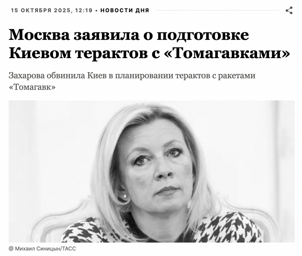 На фоне обсуждения союзниками необходимости предоставления Украине американских дальнобойных ракет Томагавк агитпроп начал активную дезинформационную кампанию на эту тему. Пытаясь сорвать принятие положительного решения администрацией США о выделении нового вооружения Украине росСМИ заявили, что президент Украины Владимир Зеленский якобы начал открыто говорить о «готовящихся терактах в России» с применением американских ракет.