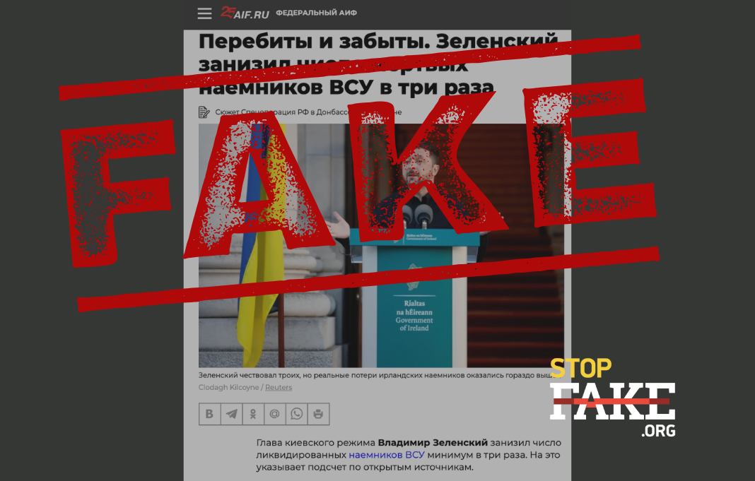Российские СМИ пишут о том, что президент Украины Владимир Зеленский во время визита в Ирландию якобы занизил количество погибших военнослужащих добровольцев-ирландцев «в три раза».