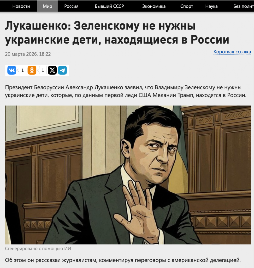 Российские СМИ распространяют заявление Александра Лукашенка о том, что президенту Украины Владимиру Зеленскому якобы «безразлична» судьба украинских детей, вывезенных в Россию, и что зарубежные лидеры более включены в эту тему, в отличие от Зеленского.