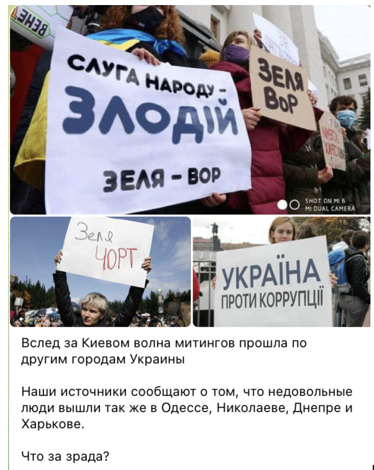 «Вслед за Киевом волна митингов прошла по другим городам Украины. Наши подпольщики сообщают о том, что недовольные люди вышли также в Одессе, Николаеве, Днепре и Харькове», — пишет агитпроп.