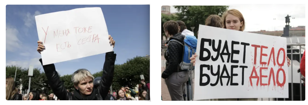 На снимках с плакатами «Зеля чорт» и «Украина против коррупции» в оригинале были надписи «У меня тоже есть сестра» и «Будет тело. Будет Дело». Они были сделаны в России еще в 2019 году. Тогда, в Санкт-Петербурге прошел митинг в поддержку сестер Хачатурян. Их подозревали в убийстве своего отца Михаила Хачатуряна. Активисты тогда заявляли, что девушки сами были жертвами, поскольку отец совершал над ними насилие. Идентичные, зеркальные фотографии можно найти на сайте «Метагазета».