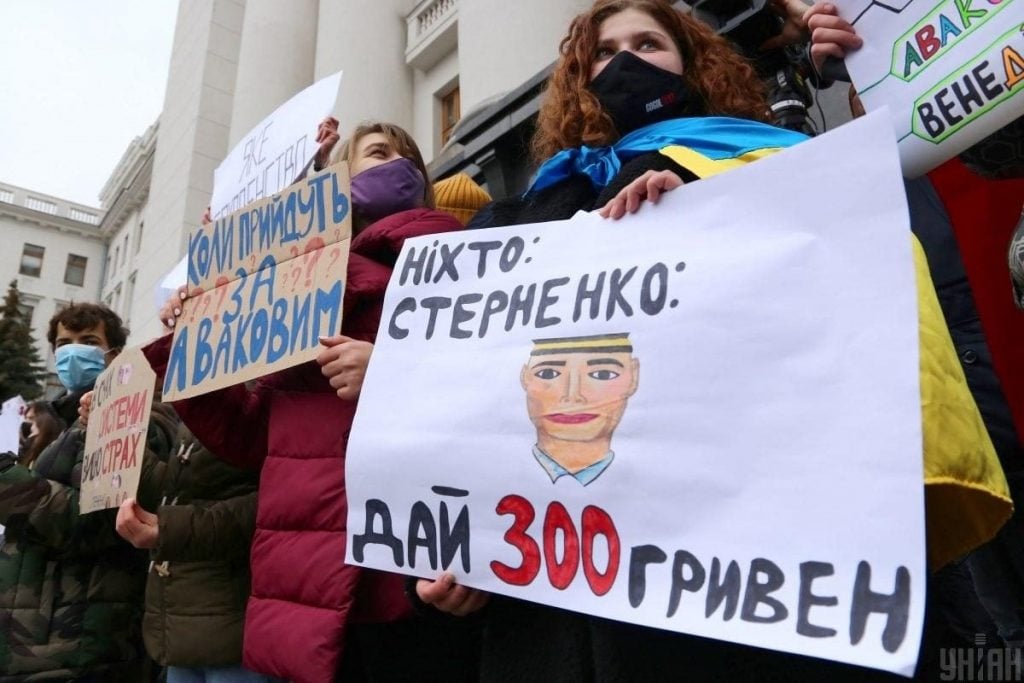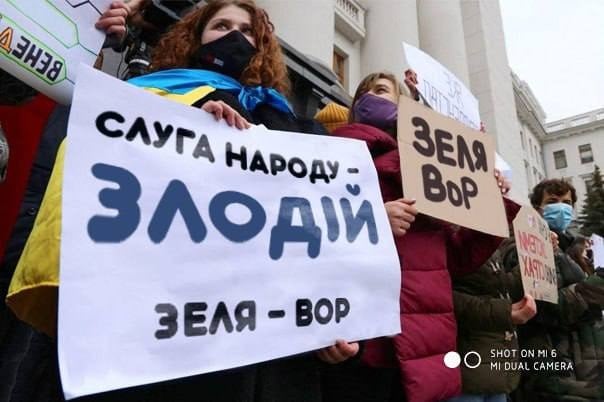 Третья фотография хоть и была сделана в Украине, но также не имеет никакого отношения к якобы текущим митингам против власти. Оригинальная фотография была сделана в 2021 году на митинге в поддержку активиста Сергея Стерненко. Тогда его приговорили к 7 годам и 3 месяцам лишения свободы по делу о похищении и пытках в подвале депутата Коминтерновского райсовета Сергея Щербича. Участники митинга считали это решение политически мотивированным и требовали пересмотра дела. Позже, апелляционный суд оправдал Стерненко. Плакат с надписью в его поддержу был изменен агитпропом на «Слуга народа – вор. Зеля – вор». Оригинальную, также зеркальную фотографию можно найти на сайте «УНИАН».