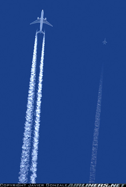 Также на показанном фото нет конденсационных следов от истребителя и Боинга. Получается, будто самолеты летели с выключенными двигателями. Для примера, фото, на котором Боинг 777 сопровождается истребителем F–18.
