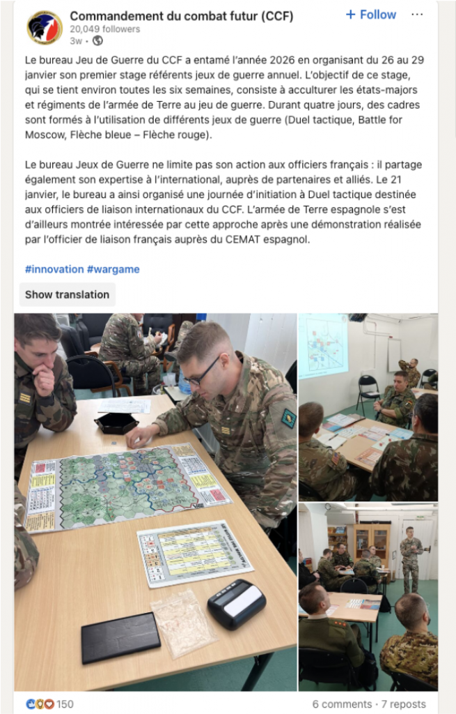 С 26 по 29 января Командование перспективных боевых действий сухопутных войск Франции (Commandement du Combat Futur, CCF) провело очередной курс по использованию военных игр в подготовке штабов. Об этом CCF сообщило в своих официальных аккаунтах в социальных сетях.
