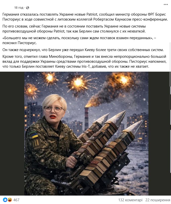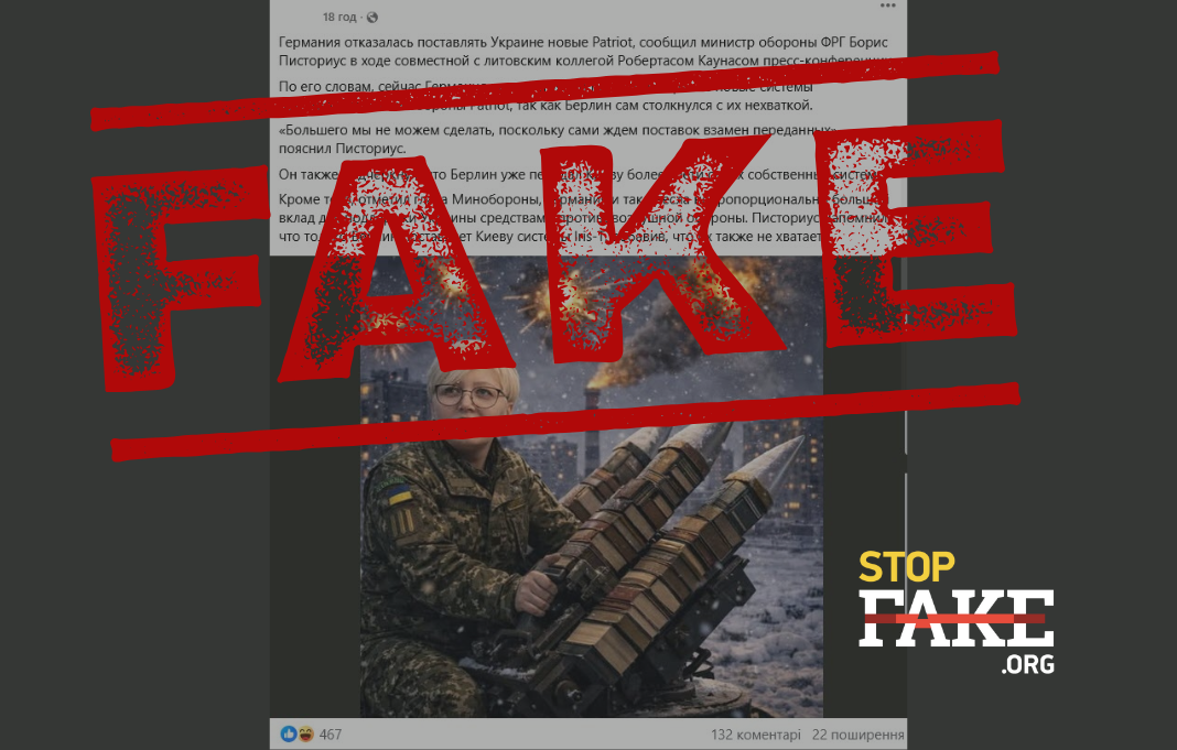 В социальных сетях и на российских сайтах распространяют информацию о том, что Германия якобы больше не будет поставлять Украине новые системы ПВО. Об этом якобы заявил министр обороны ФРГ Борис Писториус. «Хохлов прокинули. Глава бундесвера Писториус внезапно заявил, что ФРГ более не сможет усиливать возможности украинского ПВО — лимиты исчерпаны», — пишут по этому поводу российские паблики.