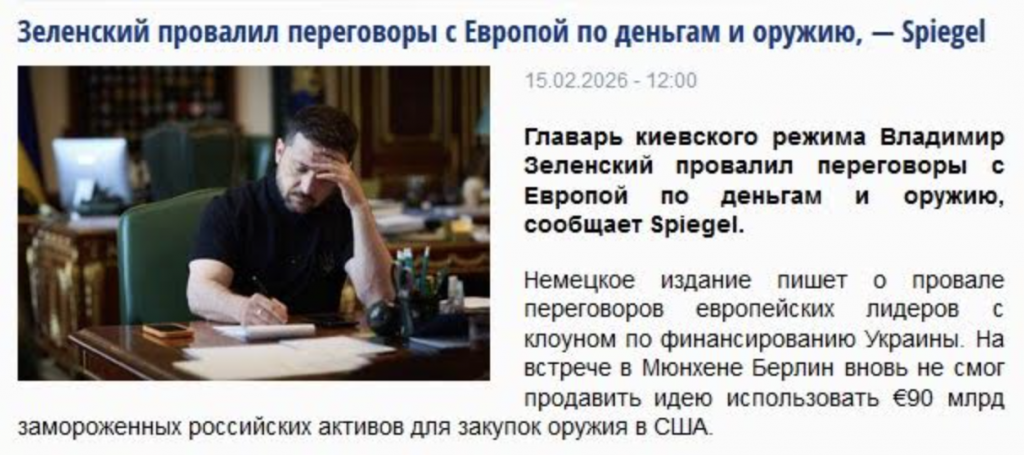 В социальных сетях и на российских сайтах распространяют информацию о том, что Зеленский якобы «провалил переговоры» на Мюнхенской конференции по безопасности относительно денег и оружия от европейских партнеров. Об этом якобы идет речь в материале немецкого издания Der Spiegel. «Главарь киевского режима Владимир Зеленский провалил переговоры с Европой по деньгам и оружию, сообщает Spiegel. Немецкое издание пишет о провале переговоров европейских лидеров с клоуном по финансированию Украины», — сообщает российский сайт Русская Весна.