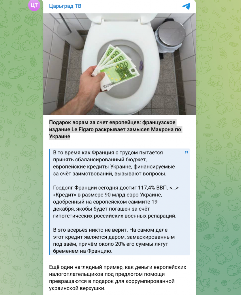 Пророссийский Telegram-канал «Царьград ТВ» распространил публикацию с громким заголовком: «Подарок ворам за счет европейцев: французское издание Le Figaro раскрывает замысел Макрона по Украине». В тексте утверждается, что Le Figaro якобы «раскрывает замысел Макрона», а европейский кредит Украине превращается в «подарок для коррумпированной украинской верхушки».