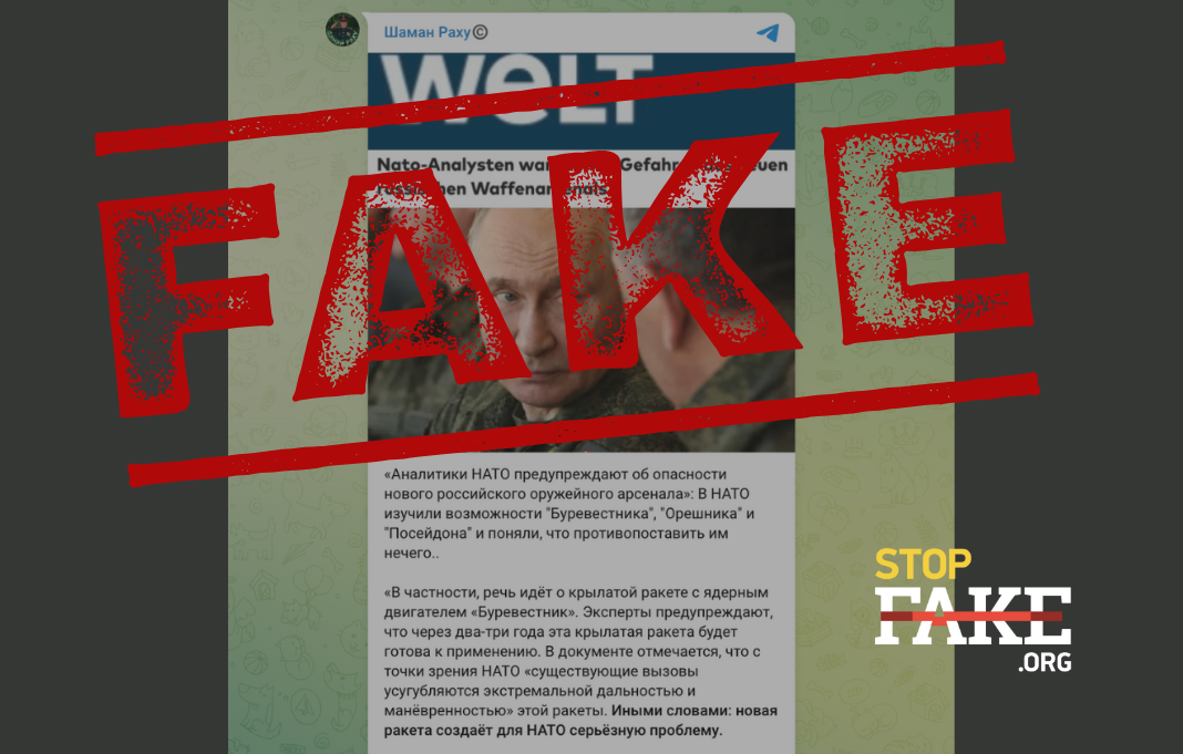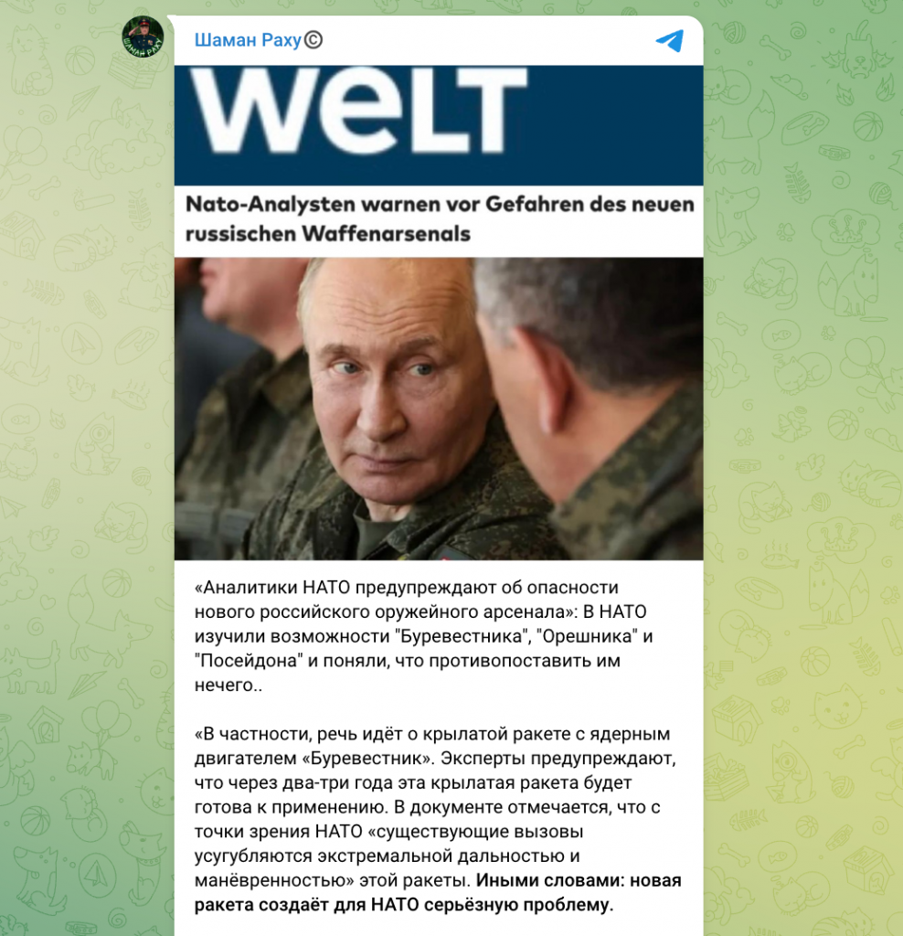 Пропагандистские Telegram-каналы и новостные сайты распространяют публикации о том, что аналитики НАТО, изучив возможности российских «Буревестника», «Орешника» и «Посейдона», якобы поняли, что «противопоставить им нечего». В публикациях говорится о том, что Запад якобы фактически признал полное военное превосходство России и беспомощность НАТО перед новым российским ядерным арсеналом.