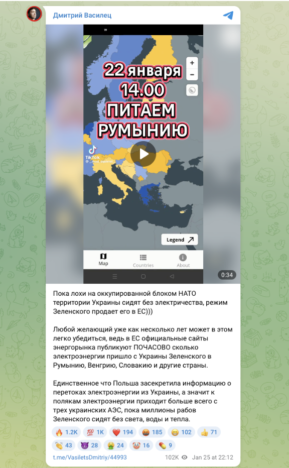 В пророссийских Telegram-каналах и на сайтах регулярно распространяются утверждения о том, что в условиях массовых отключений электроэнергии в Украине власти якобы продолжают «продавать электричество в Европейский союз», зарабатывая на этом, пока население остается без света и отопления. В качестве «доказательств» авторы таких публикаций ссылаются на данные европейских энергетических платформ, где отображаются почасовые перетоки электроэнергии между странами.