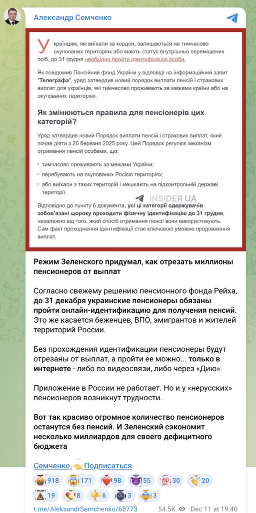 В социальных сетях и на российских сайтах публикуют новость о том, что «режим Зеленского» якобы придумал, как отрезать миллионы украинских пенсионеров от выплат. А именно: пенсионерам якобы нужно будет пройти специальную идентификацию, доступную только через интернет. «Без прохождения идентификации пенсионеры будут отрезаны от выплат, а пройти ее можно… только в интернете — либо по видеосвязи, либо через «Дию». Каков на Украине процент пенсионеров, которые смогут сделать это самостоятельно, предлагаем подумать самим. Мы как-то подозреваем, что этот процент невелик. Вот так «красиво» огромное количество пенсионеров останутся без пенсий», — сообщают в соцсетях.
