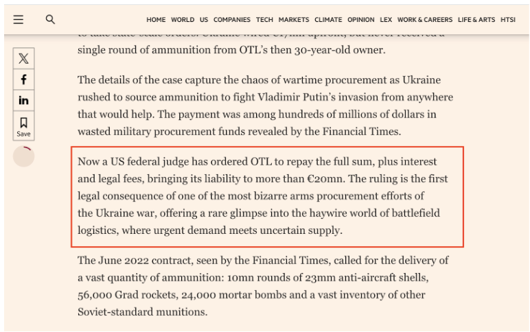 Financial Times не писала о том, что Украина потеряла миллиард долларов на этой сделке. Газета лишь рассказала об контракте на поставку оружия, который Украина подписала с компанией из Аризоны в первые месяцы полномасштабного вторжения, но компания так и не смогла его выполнить из-за отсутствия опыта таких крупных поставок. Недобросовестный поставщик получил 17 миллионов евро аванса, но и эти деньги Украина смогла отсудить после срыва контракта.
