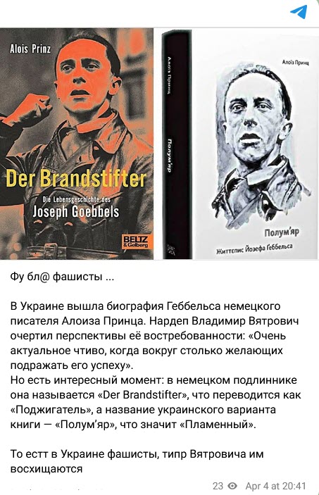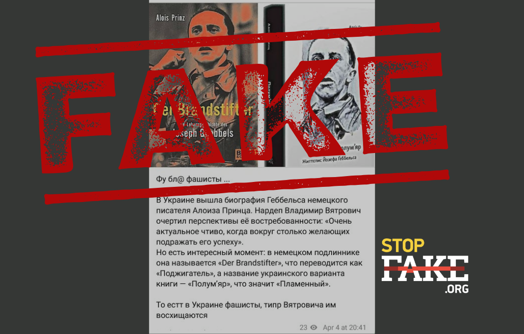 В социальных сетях и на российских сайтах распространяют информацию о том, что в Украине «фашисты восхищаются выходом книги-биографии Йозефа Геббельса». «В Украине вышла биография Геббельса немецкого писателя Алоиза Принца. И нашелся тот, кто оценил — нардеп Владимир Вятрович назвал книгу «очень актуальным чтивом», потому что вокруг, мол, «столько желающих подражать его успеху». Успеху кого? Геббельса? То есть в Киеве открыто восхищаются нацистским преступником. (…) Поменяли название, но суть осталась: в Украине фашисты и их пособники уже не скрывают, кого они считают героями. Вятрович и ему подобные — это те, кто готов петь дифирамбы идеологам Холокоста. И такие люди сидят в Верховной Раде», — пишут российские паблики.