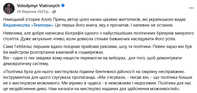 «Небольшая, но хорошо написанная биография одного из самых успешных политических лжецов прошлого века. Очень актуальное чтиво, когда вокруг столько желающих повторить его успех. Именно Геббельс первым удачно соединил приемы рекламы, шоу и политики. Уверен, сейчас он был бы мастером развертывания кампаний в соцсетях. Он — один из тех, благодаря кому нацисты победили на выборах, чтобы демонтировать демократическую систему», — пишет Вятрович на своей странице в Facebook. Из этого отрывка становится очевидным, что Владимир Вятрович критически высказывается о Геббельсе, имея ввиду пропагандистов, в том числе и российских, желающих теперь «повторить успех» главного идеолога немецкого нацизма.