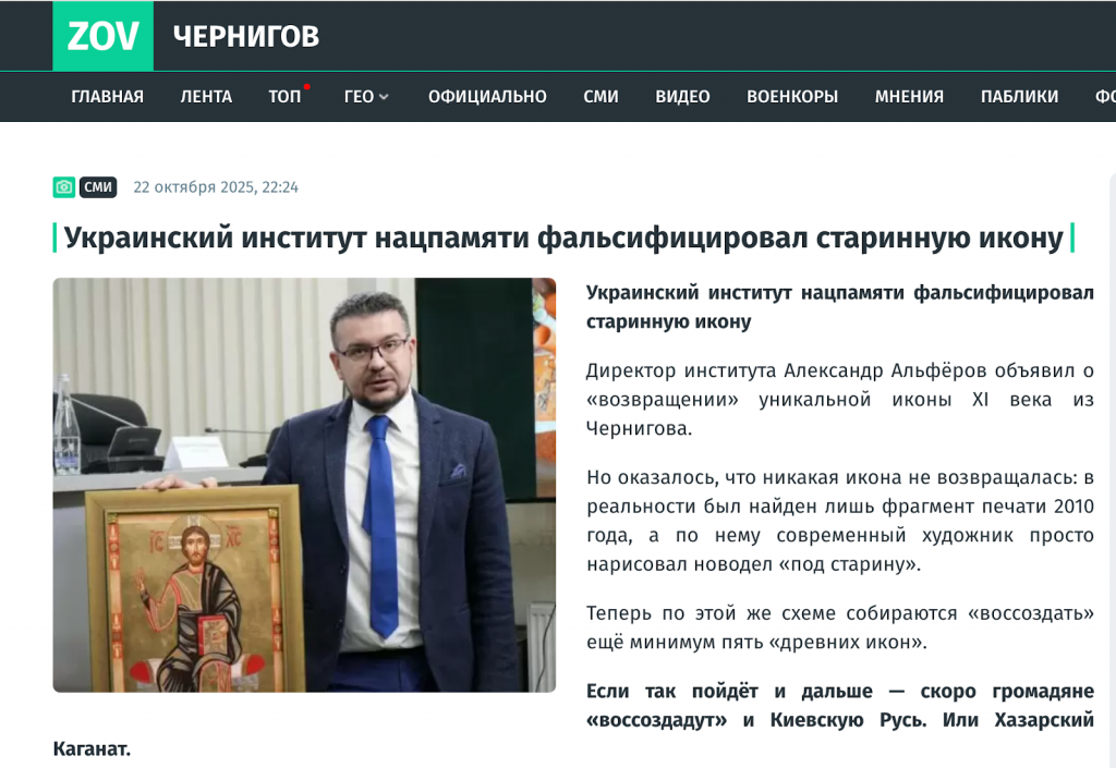 На самом деле эти заявления – не что иное, как сознательная манипуляция. Проект, о котором идет речь, не имеет ничего общего с подделкой или фальсификацией. Украинский институт национальной памяти (УИНП) под руководством историка Александра Алферова действительно представил работу, связанную с образом древней иконы из Чернигова, однако речь идет не о «реставрации» или «воссоздании оригинала», а о научно-художественной реконструкции утраченного изображения.