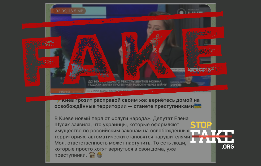Российские и пророссийские ресурсы распространяют манипулятивный тезис о том, что Украина якобы собирается преследовать собственных граждан за оформление имущества на временно оккупированных территориях по российским правилам. Основанием для этой манипуляции стал комментарий главы парламентского комитета по вопросам организации государственной власти и местного самоуправления Елены Шуляк в эфире Новини Live.