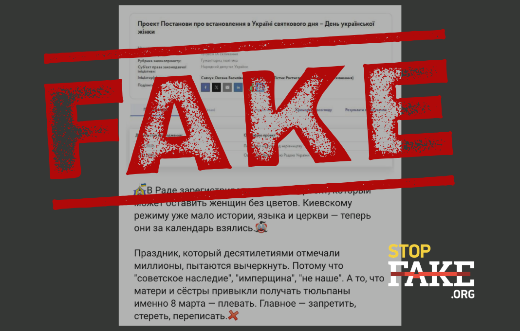 Российские и прокремлевские медиа и телеграм‑каналы начали распространять заявления о том, что в Украине якобы отменят Международный женский день и «оставят женщин без цветов». Такие сообщения стали появляться после регистрации в парламенте проекта постановления о введении нового праздника — Дня украинской женщины. Документ предусматривает возможность отмечать его 25 февраля — в день рождения Леси Украинки.