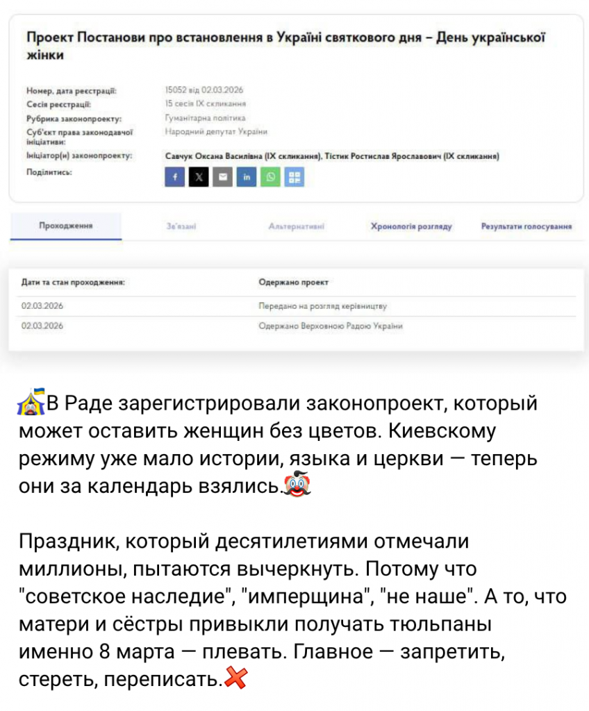 8 марта формально остается праздничной датой в украинском законодательстве, а инициатива, которую обсуждают пропагандисты, касается возможного введения нового праздника — Дня украинской женщины, а не запрета 8 марта и возможности «дарить цветы женщинам».