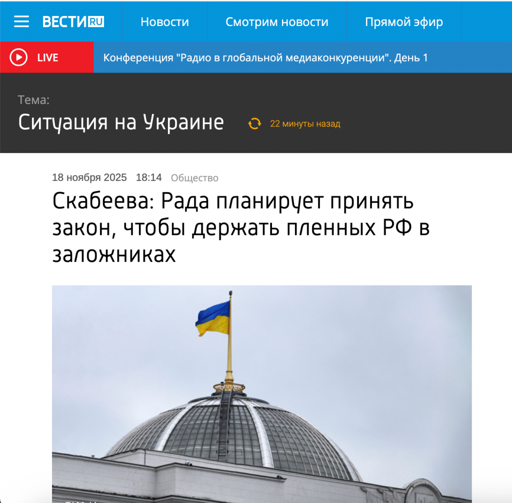 Таким образом, Скабеева и другие пропагандисты подменяют понятия: они умалчивают, что речь идет об украинцах – жертвах принудительной мобилизации, и представляют их как «российских военнослужащих», которых Украина якобы собирается незаконно удерживать. Цель такой манипуляции – представить Украину нарушителем международного права, скрыть собственные военные преступления России на оккупированных территориях и деморализовать как украинское общество, так и потенциальных пленных, внушая им, что Киев «торгует» людьми и использует их как «заложников».