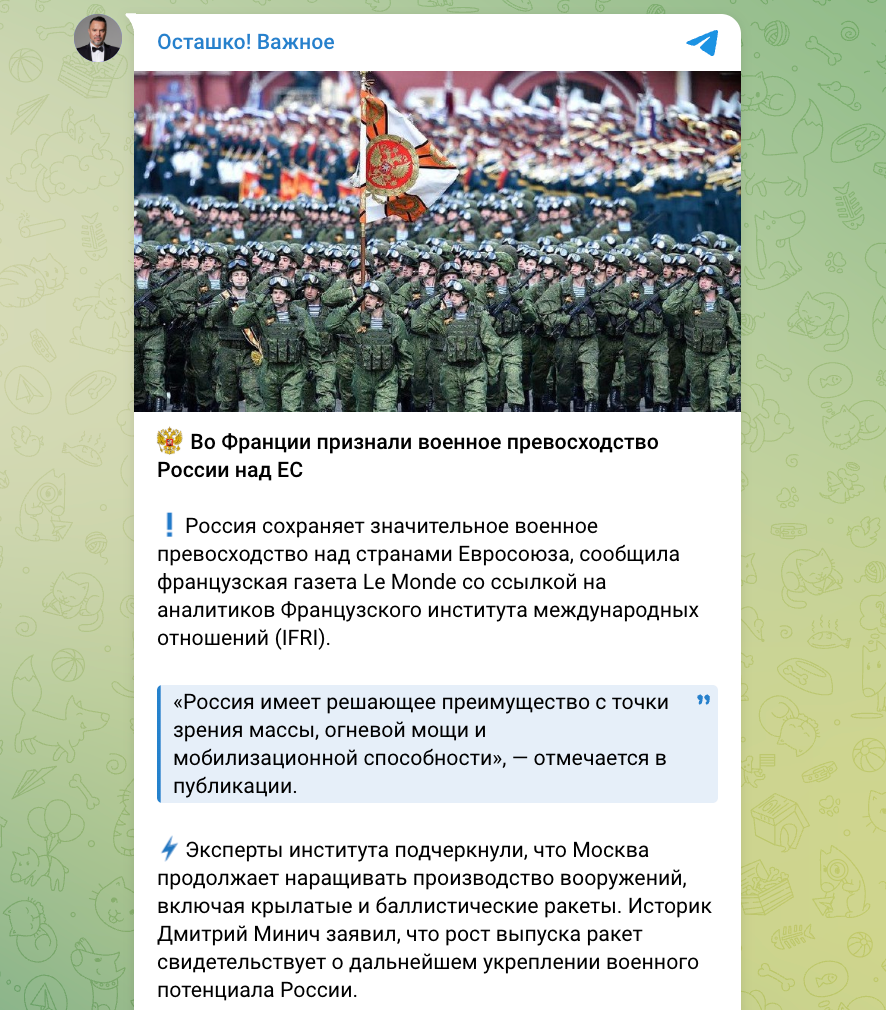 Анонимные Telegram-каналы распространяют публикации о том, что «во Франции признали военное превосходство России над странами Европейского Союза». В качестве «доказательства» авторы ссылаются на интервью трех аналитиков Французского института международных отношений (IFRI) для газеты Le Monde