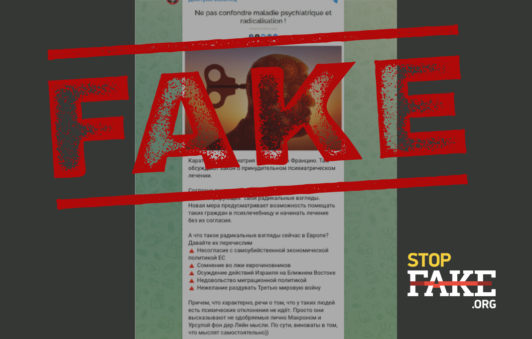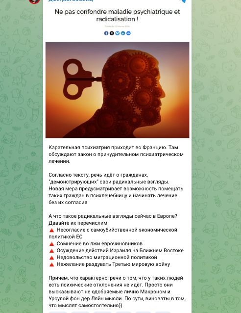 В российских Telegram-каналах распространяется утверждение о том, что во Франции якобы готовятся использовать психиатрию для преследования людей с «радикальными взглядами». В таких публикациях говорится, что французские власти якобы смогут отправлять людей в психиатрические учреждения за несогласие с политикой Евросоюза, критику миграции, осуждение действий Израиля или другие «неодобряемые» политические позиции. Авторы называют это «карательной психиатрией» и подают происходящее как очередное доказательство того, что в Европе якобы вводят репрессии против инакомыслящих.