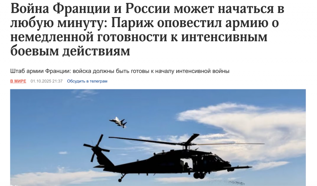 Российские медиа и анонимные Telegram-каналы распространяют утверждения о том, что между Францией и Россией якобы «может начаться война в любую минуту». В публикациях говорится, что Париж предпринимает «чрезвычайные меры» по подготовке вооруженных сил к боевым действиям против России.