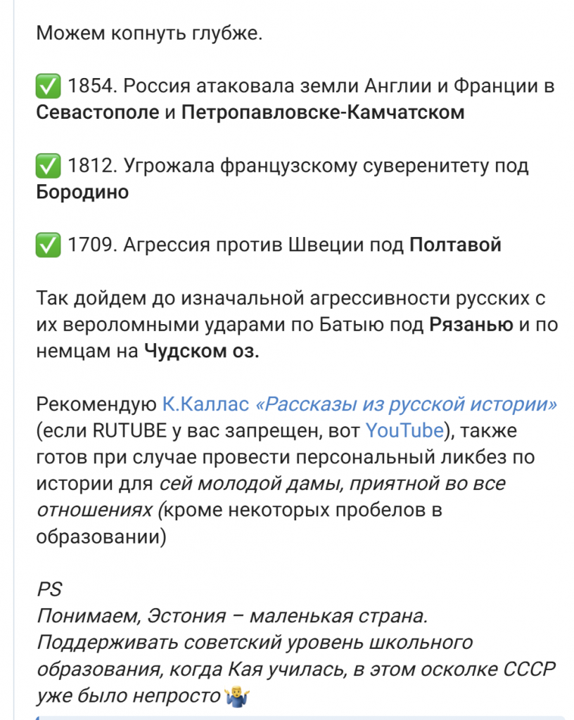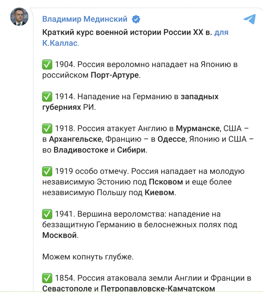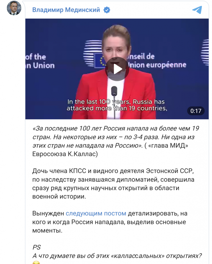 Надо отметить, что доктор исторических наук Мединский, которого в 2017 году пытались лишить этого звания, но диссертационный совет истфака МГУ был внезапно распущен, а рассмотрение перенесено в Белгородский университет, признавший диссертацию чиновника научной, в своем твите высмеивает утверждения, которые Каллас не делала. В посте Мединского упоминаются события 1709–1919 годов, в то время как Каллас говорила о случаях российской агрессии за последние 100 лет. Впрочем, он же не физико-математических наук доктор; видимо, отнять 100 от 2025 он не сумел.