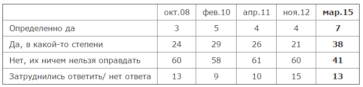 Опрос проведен 20 – 23 марта 2015 года по репрезентативной всероссийской выборке городского и сельского населения среди 1600 человек в возрасте 18 лет и старше в 134 населенных пунктах 46 регионов страны. Распределение ответов приводится в процентах от общего числа опрошенных вместе с данными предыдущих опросов. Статистическая погрешность данных этих исследований не превышает 3,4%