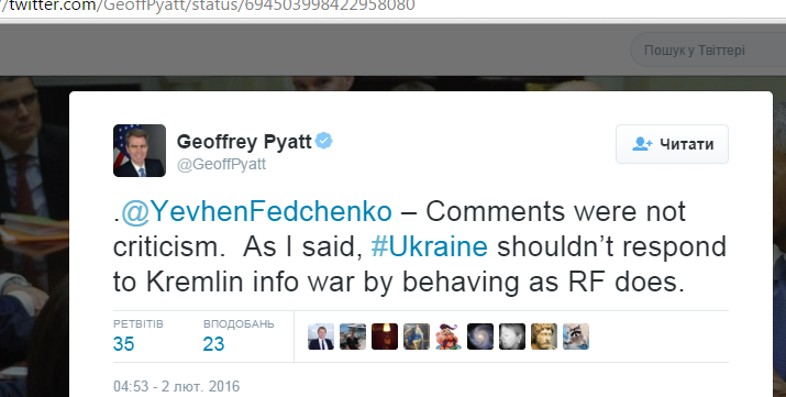 В материале используется заявление Джеффри Пайетта, Посла США в Украине, которое он озвучил на конференции на тему информационной войны и средств борьбы с нею в Украине. Пайетт заявил, что Украине не нужны новые государственные медиа и не стоит идти на поводу пропаганды, пытаясь ее опровергнуть и убедить другую сторону. По словам Пайетта, то, «что нужно Украине — так это успешная Украина». Посол добавил, что самое сильное средство в гибридной войне Кремля, которое имеет в своем арсенале Украина – так это возможность стать успешной, современной, европейской и демократической страной.