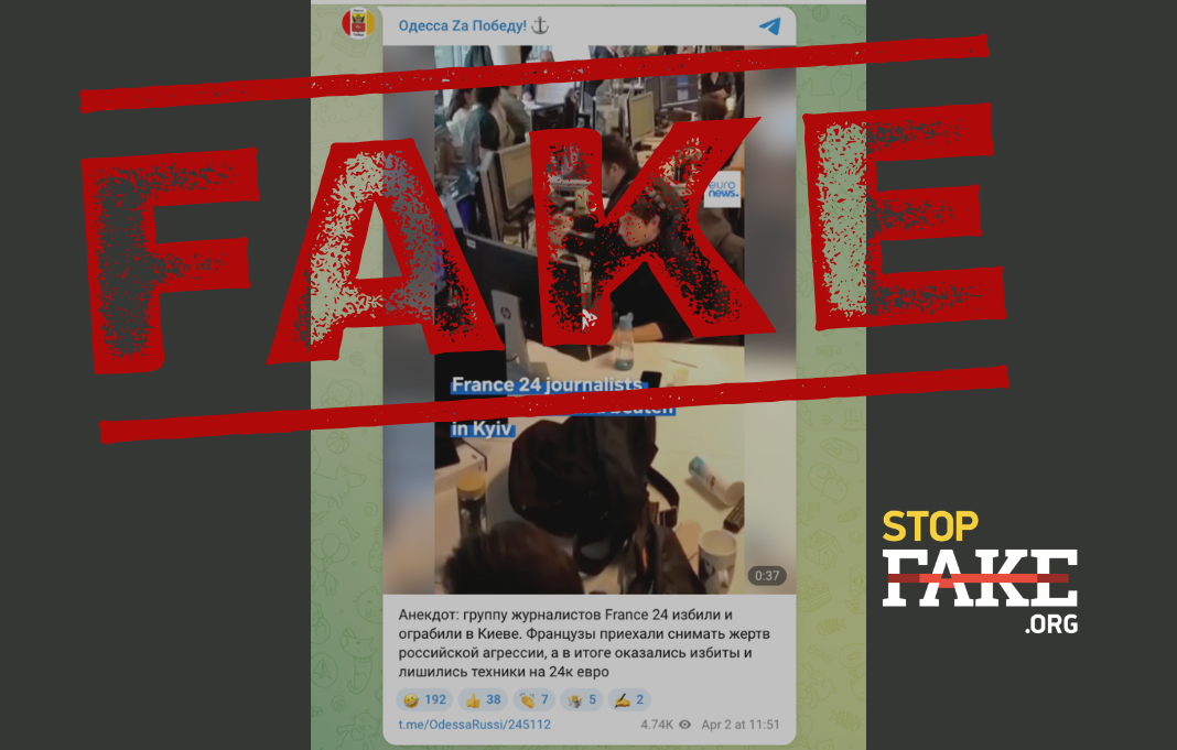У мережі поширюється відеоролик із символікою відомого європейського інформаційного телеканалу Euronews, в якому стверджується, що під час роботи в Україні група журналістів із французького видання France 24 нібито зазнала побиття та пограбування – у них викрали техніки на 24 тисячі євро. Автори таких публікацій наголошують на тому, що французькі журналісти приїхали до Києва знімати наслідки російської агресії, а в результаті самі стали жертвами нападу.