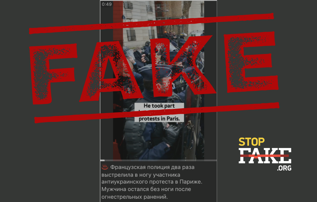 У проросійському сегменті мережі поширюється ролик з жінкою, яка нібито розповідає про поранення, що його зазнав її хлопець, учасник антиукраїнських мітингів у Парижі: поліція буцімто прострелила йому ногу та відмовила в наданні медичної допомоги, внаслідок чого юнак втратив кінцівку. Героїня відео говорить, що десятки тисяч людей по всій Європі протестують проти «вбивчого та корумпованого» режиму Зеленського в Україні, однак французький уряд ці протести придушує.