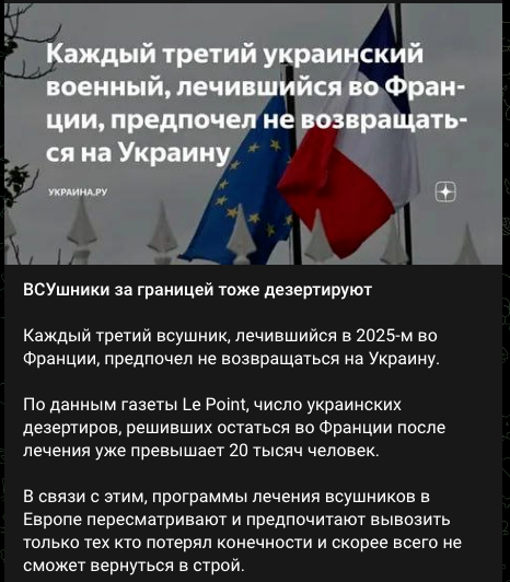 У мережі поширюється відео з логотипом авторитетного французького тижневика Le Point, в якому закадровий голос англійською мовою стверджує, що «кожен третій солдат ЗСУ, який проходив лікування у Франції у 2025 році, не повернувся до України», а загальна кількість тих, хто «залишився», начебто взагалі перевищує 20 000 осіб. Додатково у відео стверджується, що французька поліція нібито фіксує численні випадки долучення українських військових до французького криміналітету, а представниця крайньої лівої партії «Lutte Ouvrière» («Боротьба трудящих») Наталі Арто (Nathalie Arthaud) підтвердила загрозу від присутності в країні «20 000 солдатів у стані ПТСР.» Титри в кінці відео приписують авторство Борису Ганзелю (Boris Hansel) та відеографу П’єру Ле Муелліку (Pierre Le Mouellic).