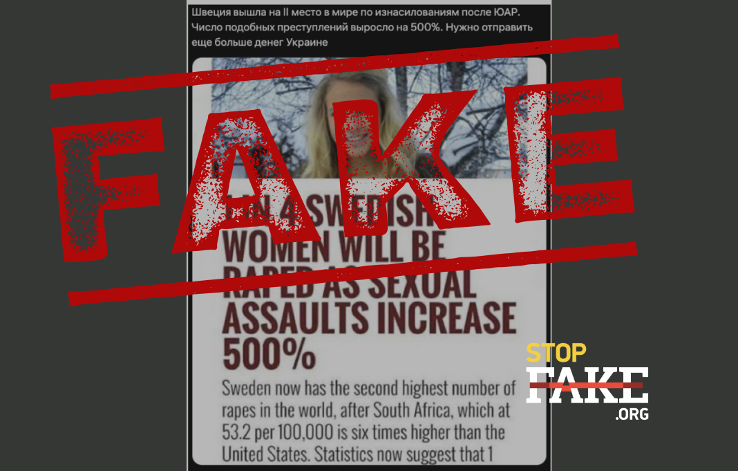 У проросійському сегменті мережі поширюється скриншот заголовка, який стверджує, що рівень згвалтувань у Швеції зріс на 500%, і тепер кожна четверта жінка за своє життя стане жертвою сексуального насильства. «Треба відправити ще більше грошей Україні», іронічно коментують новину пропагандисти, натякаючи, що Швеції варто зайнятися внутрішніми проблемами замість підтримки боротьби проти російської агресії.