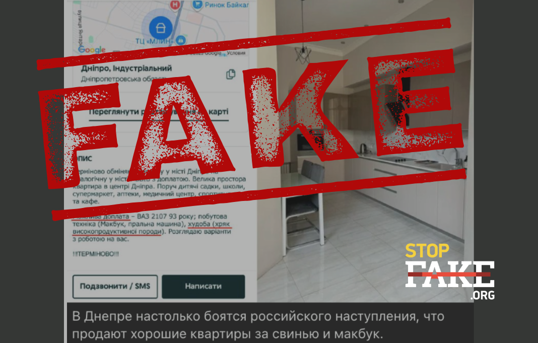 У проросійському сегменті мережі поширюється новина про нібито тривожну тенденцію в Дніпрі: мешканці міста за безцінок позбавляються своєї нерухомості через «страх російського контрнаступу». На доказ цього пропагандисти поширюють скриншот оголошення на платформі OLX. Користувач буцімто пропонує обміняти житло в Дніпрі на квартиру у Львові з можливою доплатою, при тому готовий віддати покупцю власний автомобіль, побутову техніку чи хряка, або навіть відпрацювати різницю.