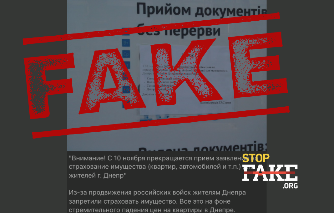 У проросійському сегменті мережі поширюється фото оголошення, в якому нібито повідомляється, що страхова група «ТАС» припиняє прийом заявок на страхування майна від мешканців Дніпра та Дніпропетровської області. Пропагандисти припускають, що справа –  у «стрімкому просуванні російських військ».