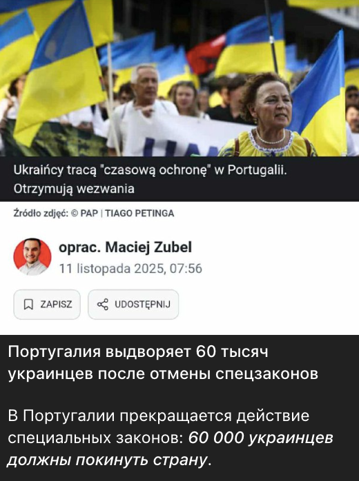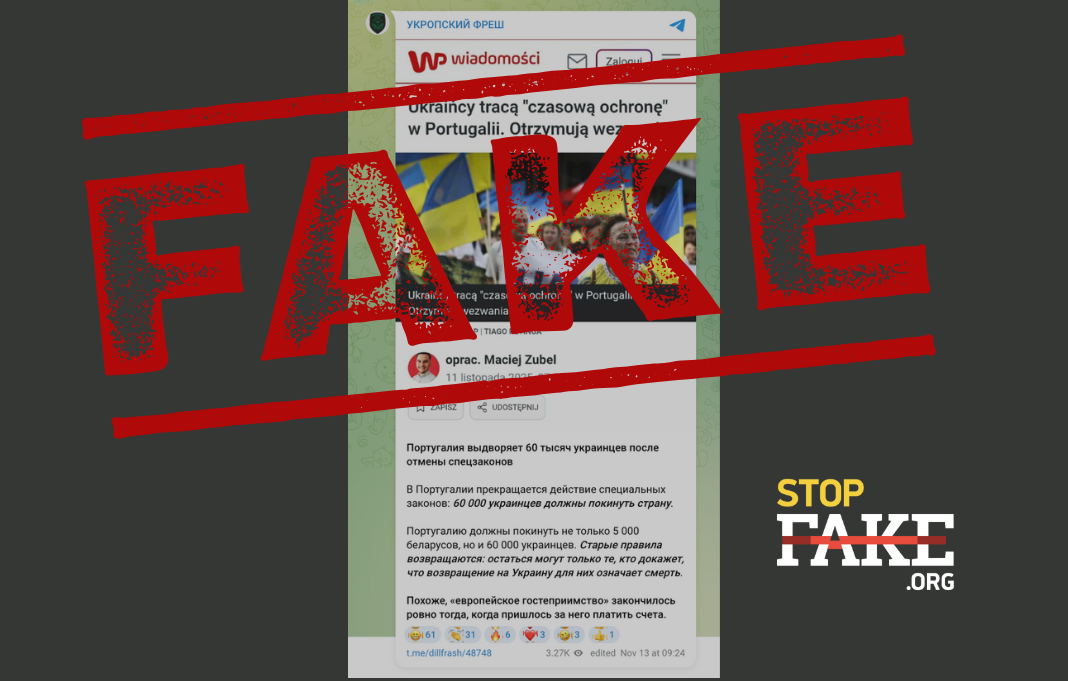 Пропагандистські джерела повідомляють, що Португалія нібито збирається вигнати 60 000 українських біженців через зміни в законодавстві. Крім того, додому доведеться повернутися 5 000 білорусів, які отримали в країні політичний притулок. «Здається, європейська гостинність закінчилась саме тоді, коли за неї довелося платити», іронічно підсумовують публікації на цю тему.