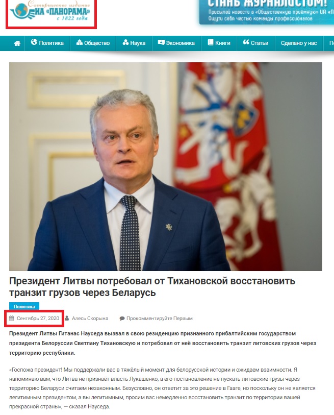 Користувачі соціальних мереж поширюють інформацію про те, що президент Литви Гітанас Науседа зажадав від опозиційного політика з Білорусі Світлани Тихановської відновити транзит вантажів через її країну. Насправді ж президент Литви не висував подібних вимог, а інформацію було взято із сатиричного видання «Панорама».
