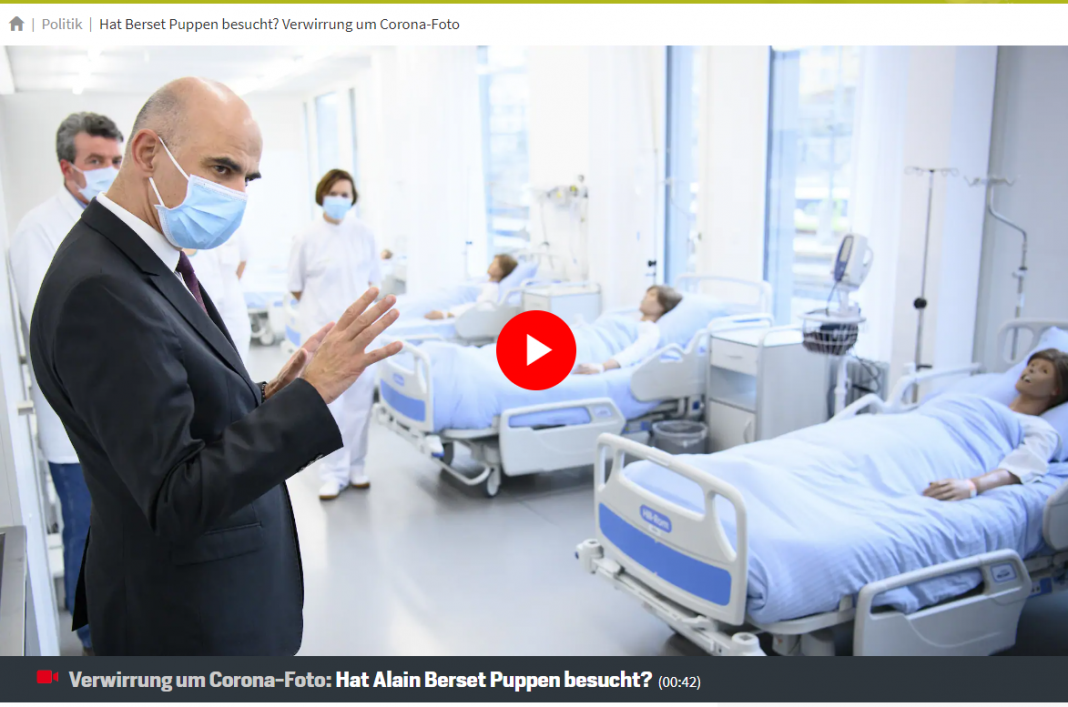Передусім Ален Берсет не є прем’єром Швейцарії, і власне це має насамперед звернути увагу читачів, що вони мають справу з фальшивою новиною. По друге, важко повірити, аби хтось з поважаючих себе політиків дозволив сфотографувати себе з манекенами, роблячи вигляд, що відвідує відділення хворих на Ковід. Подібну містифікацію легко викрити, що доводять фотографії. Отже, звідки ця новина?