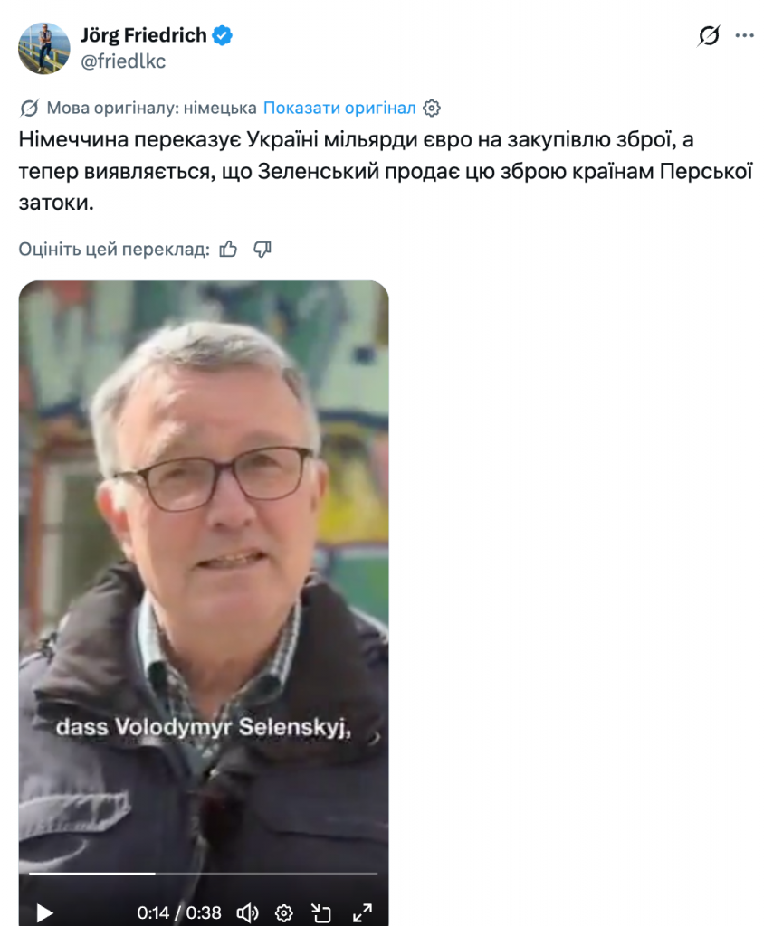 Користувачі в соцмережах розповсюджують наратив про те, що президент України Володимир Зеленський нібито перепродає західну зброю, зокрема закуплену Німеччиною, країнам Перської затоки.