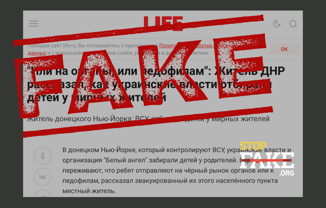 Українські й міжнародні ЗМІ зробили вже багато репортажів про те, як відбувається евакуація мирного населення та дітей, у тому числі з лінії фронту. На пропагандистському відео, яке й стало інформаційним приводом для російського фейку, чоловік згадує сім’ю з трьох дітей, у яких померла мати, мовляв, насправді їх віддали на органи або педофілам. Але й про цю сім’ю можна знайти новинні матеріали — волонтери відвезли їх до родичів. Поліція Донецької області зазначає, що ювенальні поліцейські Донеччини мають з дітьми постійний зв’язок, адже сиротам потрібна допомога.