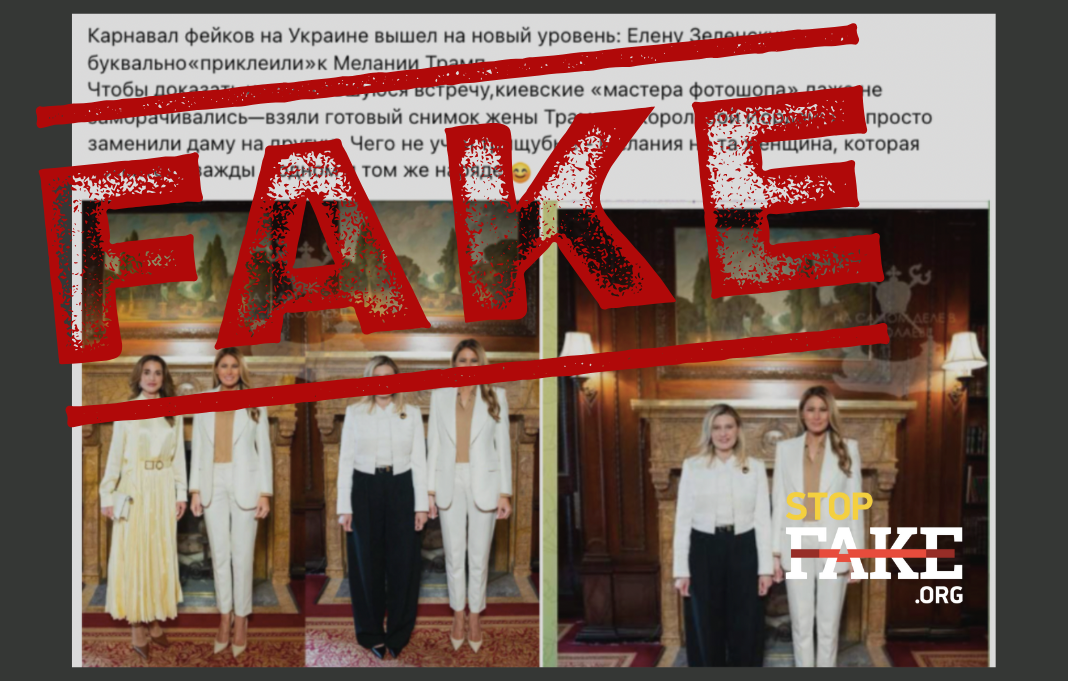 Російські джерела стверджують, що українські медіа нібито сфабрикували факт зустрічі Олени Зеленської з Меланією Трамп: першу леді України буцімто «домалювали» на знімок Меланії Трамп, яка насправді фотографувалася з королевою Йорданії Ранією аль-Абдаллою. Пропагандисти вважають, що нібито підробку видає те, що Меланія Трамп ніколи не з’являється на публіці в одному й тому ж образі двічі.