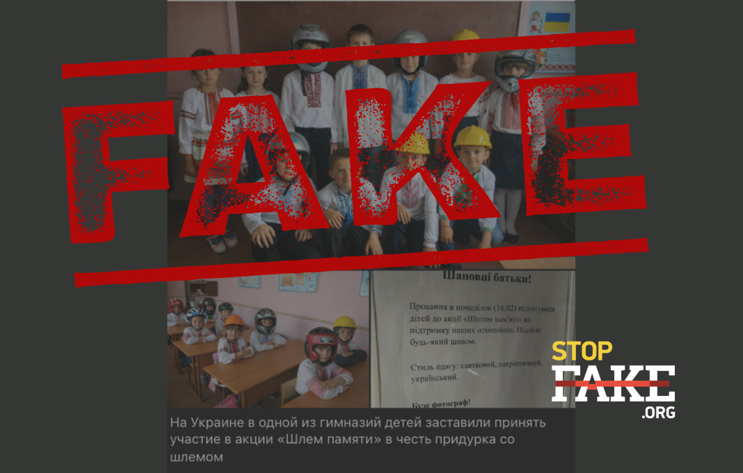 У проросійських ресурсах активно поширюється новина про те, що школярів однієї з українських гімназій буцімто змусили взяти участь в акції «Шолом пам’яті» на знак солідарності з олімпійським атлетом Гераскевичем: діти прийшли в школу в касках, мотоциклетних та навіть боксерських шоломах.