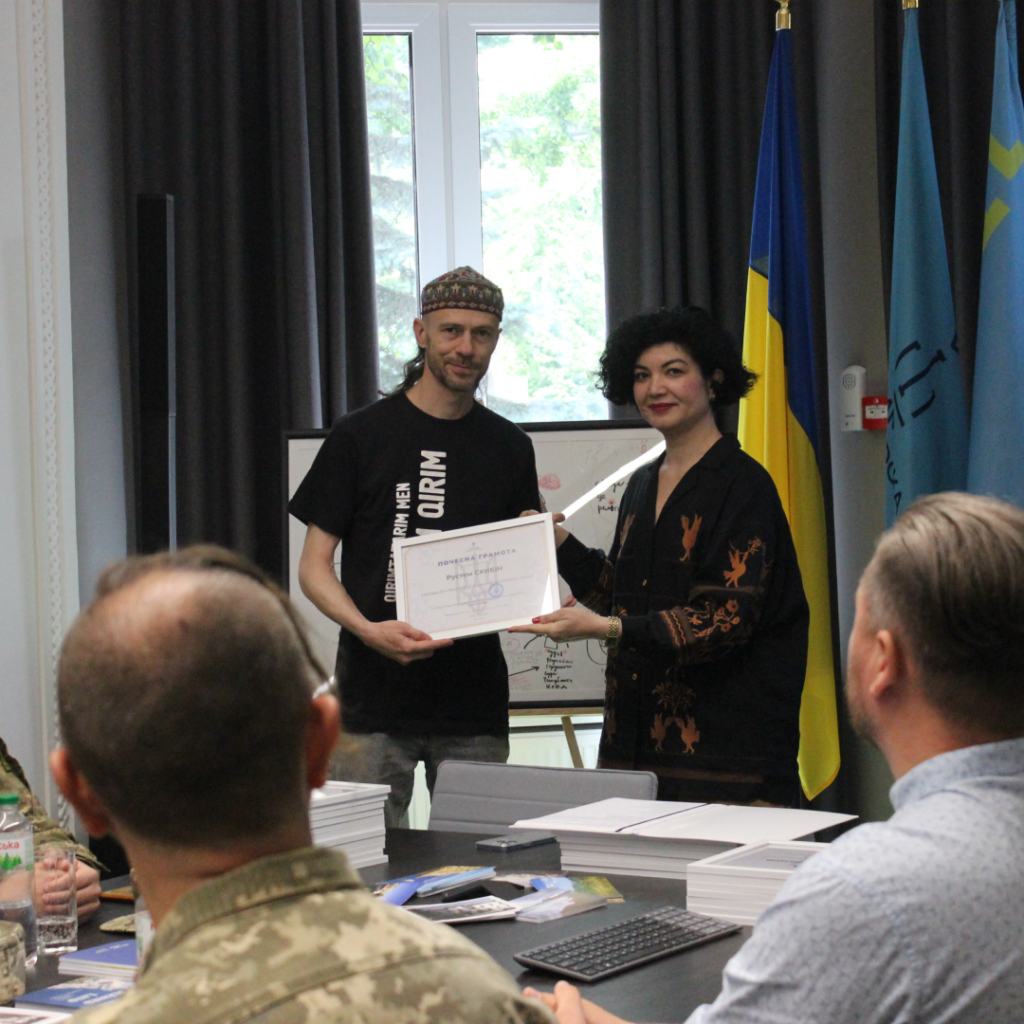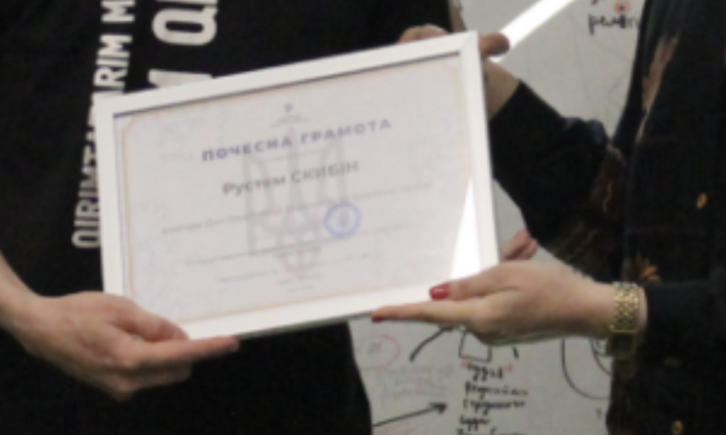 Таблички в руках чоловіків теж не виглядають справжніми. Літери на папірцях занадто плоскі й штучні, складається враження, що їх наклали на реальне зображення за допомогою фоторедактора. Порівняймо зі справжнім фото з події, де урочисті грамоти вручали кримським військовослужбовцям та митцям: на реальному знімку перспектива дещо спотворює літери, текст не такий плоский і «читабельний», а сама табличка не настільки рівномірна через текстуру матеріалу та освітлення.