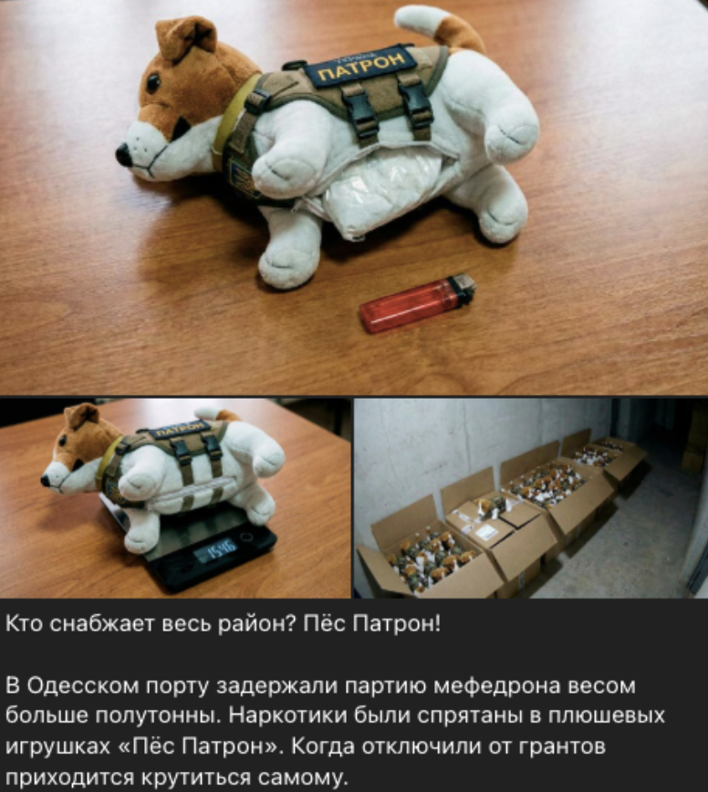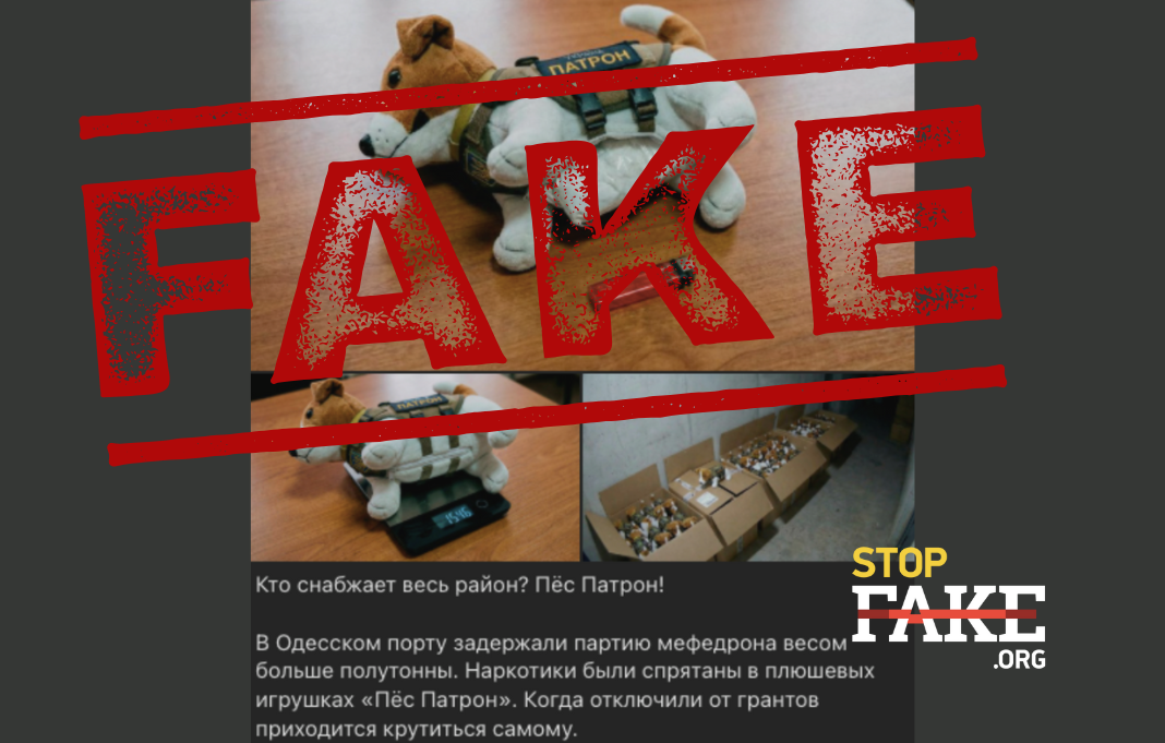 У мережі поширюється новина про те, що в порту Одеси правоохоронці буцімто затримали партію мефедрону вагою більш як півтони. Наркотичні речовини нібито сховали у плюшевих іграшках у вигляді пса Патрона. Новину поширили не тільки російськомовні ресурси, а й чеські джерела антиукраїнського спрямування.