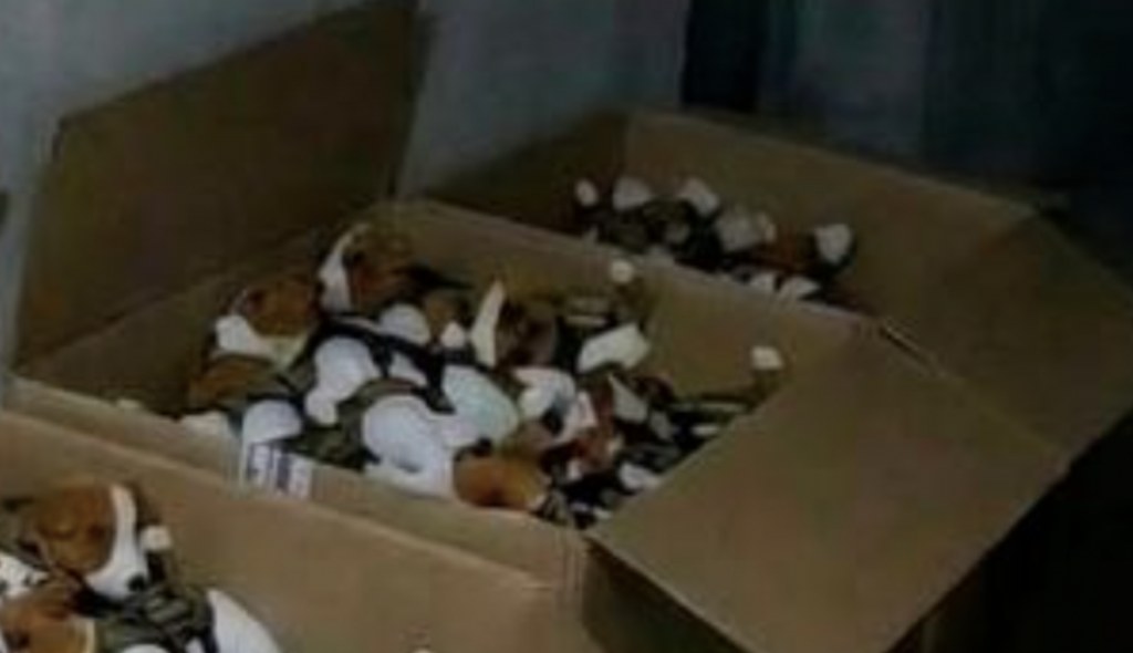 На фото, де іграшка лежить на столі, на морді песика бачимо чорну деталь трикутної форми. Однак на знімку, де багато іграшок лежать в ящиках, деталь уже відсутня.