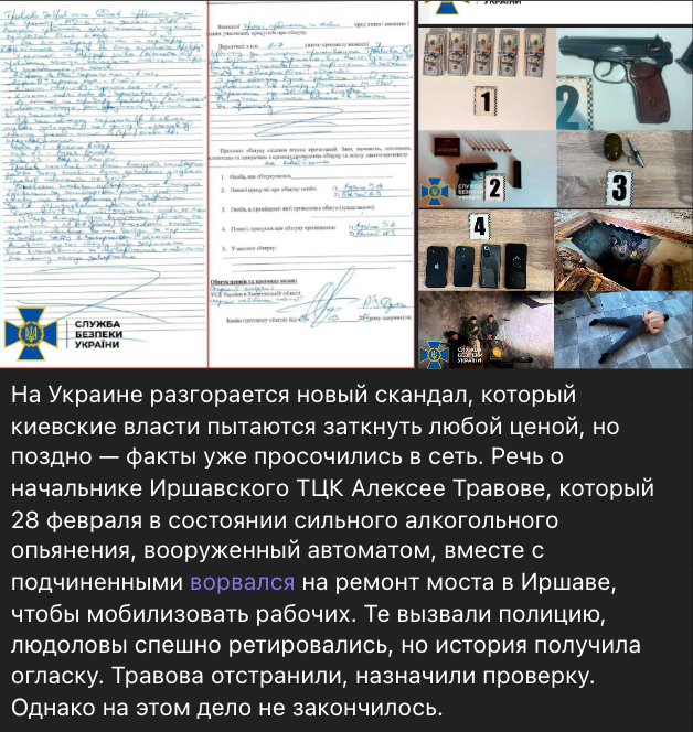 У проросійському сегменті поширюються нібито нові подробиці історії з відстороненням начальника Іршавського ТЦК Олексія Травова. Пропагандисти стверджують, що СБУ провела обшук у його домі, де виявила не лише гроші й зброю, а й трьох людей, замкнених у підвалі. Ці люди нібито є українцями з угорським громадянством, а Травов утримував їх силоміць, змушував працювати на будівництві та погрожував відправити до штурмових підрозділів. Новина активно поширюється не тільки російською, а й польською, чеською, словацькою та угорською мовами. На доказ наводяться нібито фото та протоколи обшуку з логотипом СБУ.