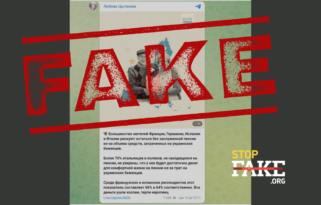 У мережі поширюється відеоролик із символікою відомого європейського інформаційного телеканалу Euronews, у якому стверджується, що більшість жителів Франції, Німеччини, Іспанії та Італії нібито ризикують залишитися без заслуженої пенсії через кошти, витрачені на допомогу українським біженцям.