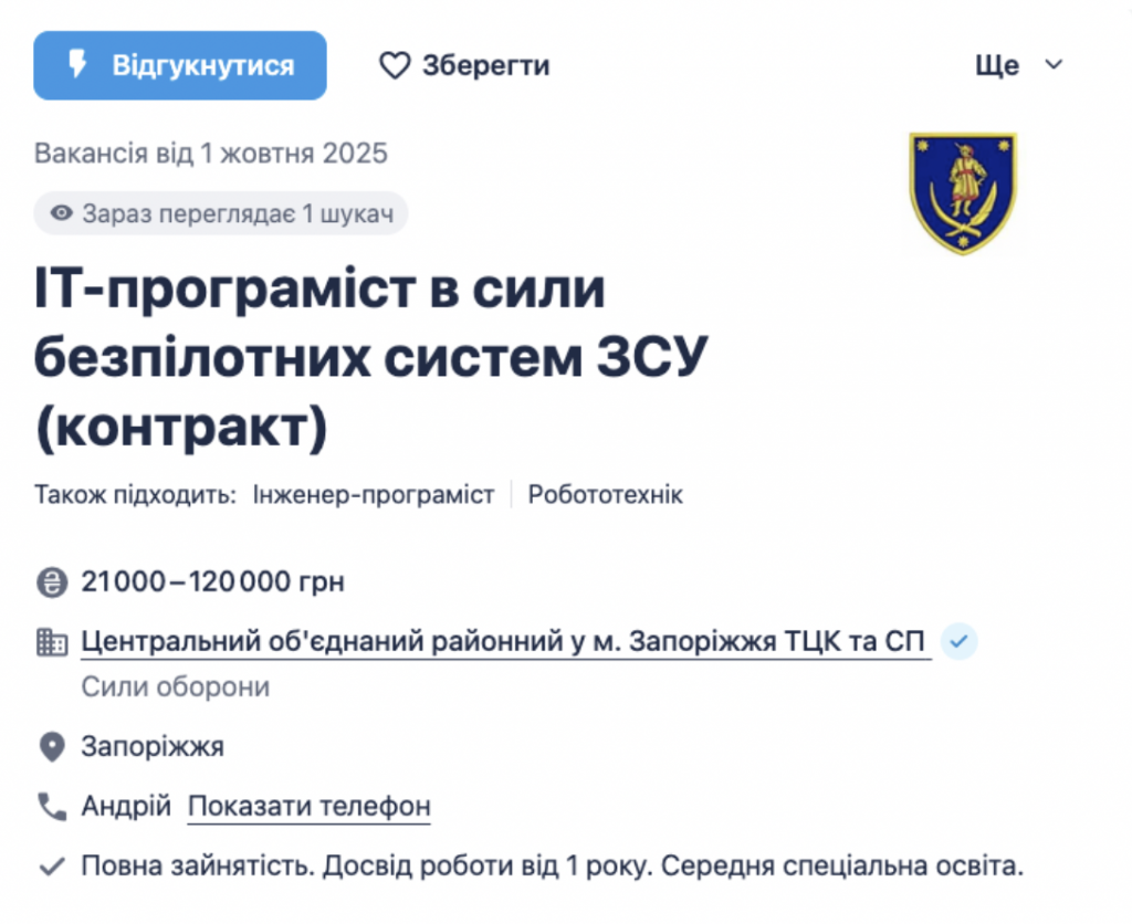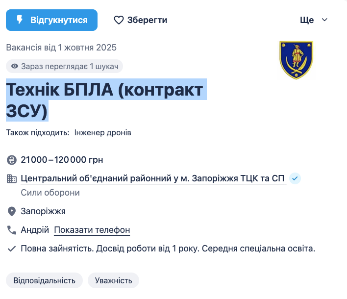 Та насправді ТЦК не публікував такого оголошення — його підробили пропагандисти. На сайті work.ua і справді є низка вакансій, розміщених запорізьким ТЦК та СП 1 жовтня, але жодна з них не запрошує «фахівців для роботи з кандидатами». Натомість, наразі в ТЦК шукають ІТ-програміста в сили безпілотних систем ЗСУ, техніка БПЛА та фельдшера. Кандидатам пропонують швидке оформлення на службу (48 годин) та можливість самостійно обрати місце служби з гарантією, що під час воєнного стану їх не переводитимуть в інший підрозділ без згоди. Вірогідно, саме на основі одного з цих оголошень пропагандисти і створили свій фейк. Усього ж відділ рекрутингу запорізького ТЦК розмістив на сайті 24 актуальні вакансії, за якими запрошує до служби за контрактом.