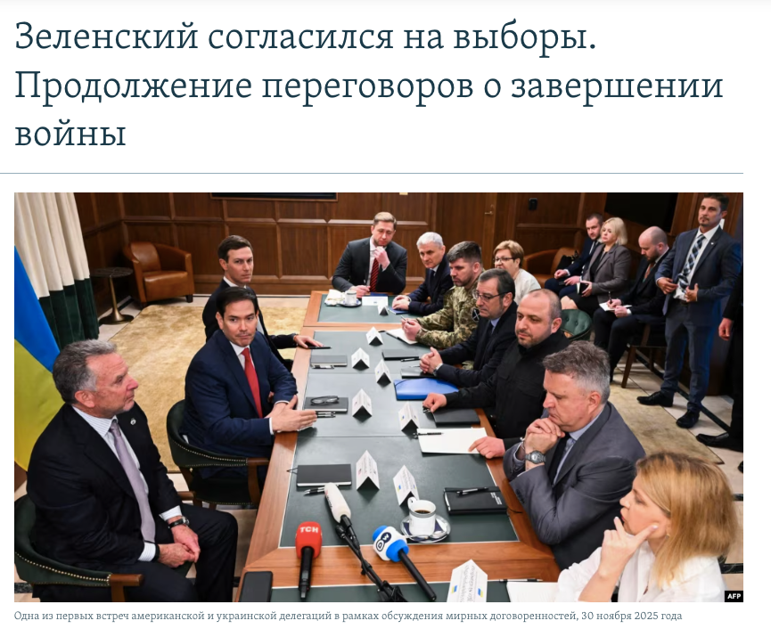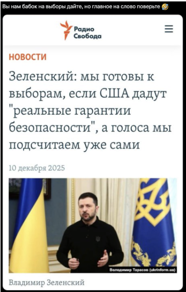У проросійському сегменті мережі поширюється скриншот нібито тексту, який опублікували у виданні «Радіо Свобода». Згідно з заголовком, Володимир Зеленський заявив, що готовий до проведення виборів в Україні за умови реальних гарантій безпеки від США — однак тільки в тому разі, якщо голоси уряд рахуватиме сам. «Грошей на вибори дайте, але на слово повірте», висміюють висловлювання українського президента пропагандисти.
