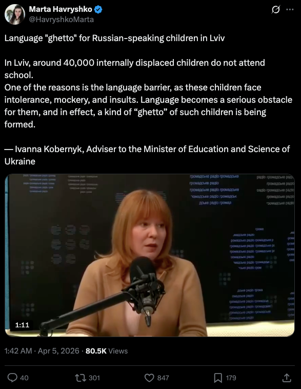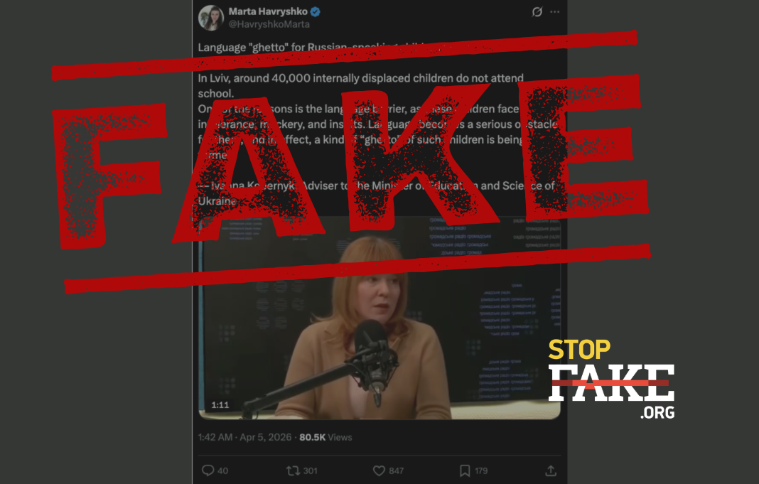 У проросійському сегменті мережі поширюється уривок з інтерв’ю Іванни Коберник, співзасновниці ГО «Смарт освіта», яка стверджує, що з 50 000 дітей-ВПО, що проживають в безпечних регіонах України, лише 10 000 ходять в місцеві школи. Інші ж залишаються на дистанційному навчанні нібито через «мовне цькування» та насмішки щодо поганого володіння українською. Серед інших відео поширила в X і Марта Гавришко: її англомовна публікація на цю тему зібрала понад 300 ретвітів та низку реакцій на кшталт «Бідні діти. Їм краще було б Ростові чи Краснодарі», «і це західні цінності, які намагається впровадити ЄС? Ненависть та дискримінація» та «саме тому Путін і піклується про дітей з завойованих Росією регіонів» від англомовної аудиторії.